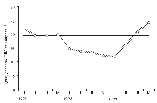 Рис. 3.16. Поквартальная динамика цены на нефть в 1997–1999 гг. на фоне среднего исторического уровня