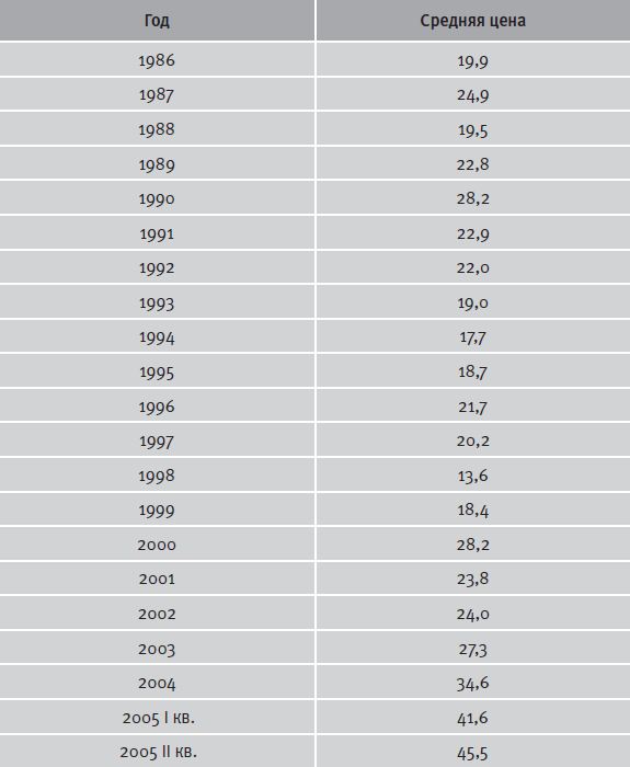 Таблица 3.7. Динамика мировых цен на нефть в 1986–2005 гг. (долл. за 1 баррель[212]212
