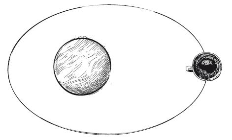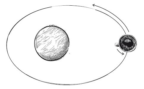 – Представьте: эта чашка – и есть Меркурий. Если бы мы сейчас находились на нем, в районе ручки, к примеру, то Солнце видели бы прямо над головой. Вот наш Меркурий движется вокруг Солнца, – академик начал медленно вести чашку вдоль нарисованной орбиты, одновременно поворачивая ее в том же направлении. Когда чашка прошла примерно две трети своего пути, он остановился. – Планета сделала полный оборот вокруг своей оси. Закончились первые звездные сутки.