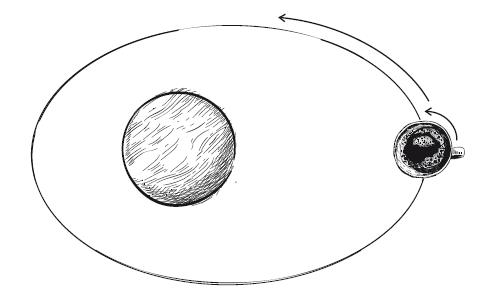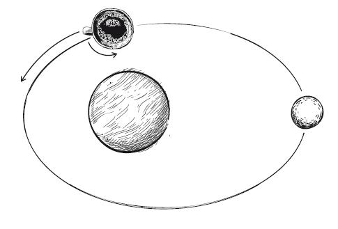 – Солнечные сутки продолжаются. В точке наблюдения сейчас ночь. – Чашка вновь заскользила по бумаге. – Второй оборот вокруг своей оси, вторые звездные сутки, – Валик приостановил чашку в тот момент, когда она прошла еще одну треть нарисованной орбиты и снова оказалась повернута ручкой влево.