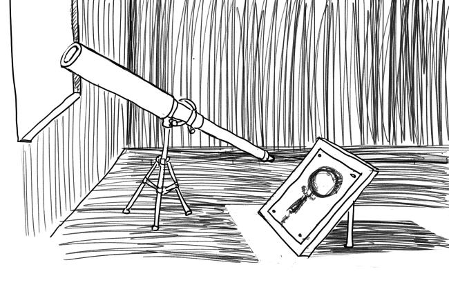 – Первым делом нужно собрать штатив, – отец начал разгребать сложенные в кучу металлические палки и пластиковые колпачки. Мальчишки принялись ему помогать. Спустя двадцать минут на полу в середине комнаты встала тренога метровой высоты. К ней прикрепили держатель с кольцами, вставили в него телескоп. Сбоку пристроили игрушечную подзорную трубу. Отец немного повозился с настройкой и объявил: