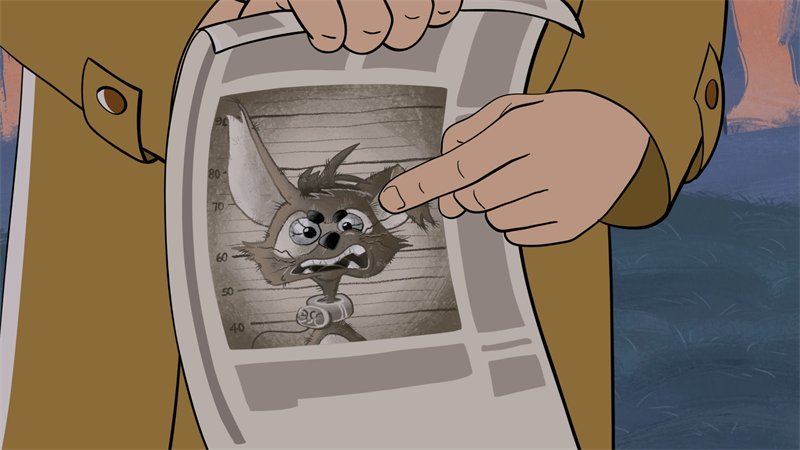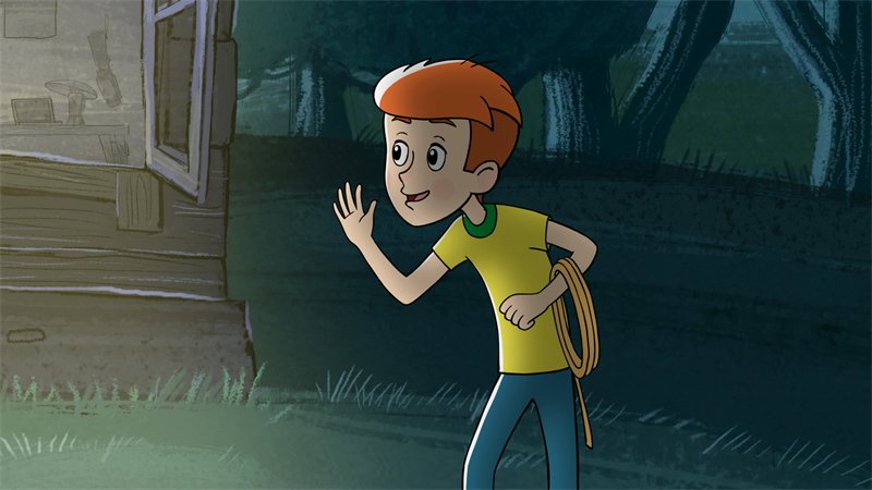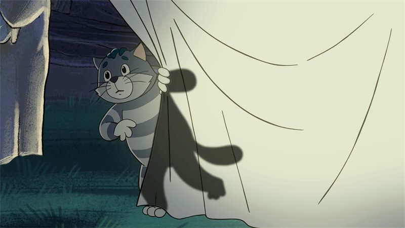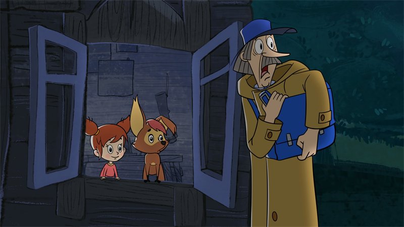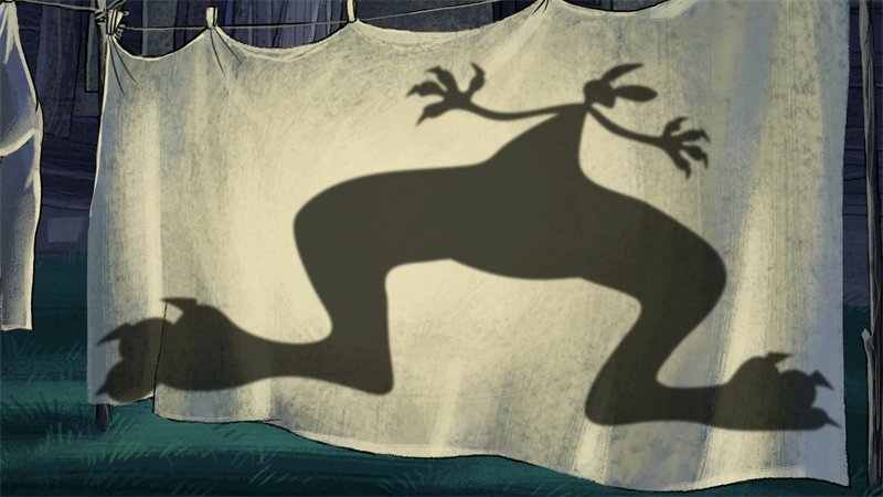 На улице стало уже совсем темно. Только звёзды в небе сверкали и ярко светили в окна дома. Озираясь, Печкин шёл к друзьям, чтобы рассказать им свежие новости – за поимку опасного зверя вознаграждение повысили. Но знакомый путь почтальону вдруг преградили веревки с развешенными на них белыми простынями. Печкин запутался в них, как в сетях. Вдруг сквозь белое полотно он увидел силуэт гигантского чудовища.