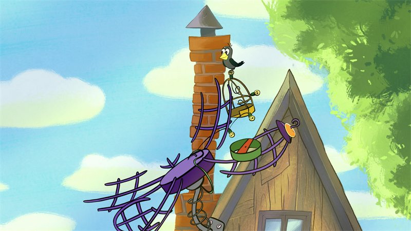 На крыше, на самой верхушке, стояла антенна – белая телетарелка с двумя металлическими усиками. На них Галчонок, как на новогоднюю ёлку, нанизывал разные «сокровища» – красную варежку Веры Павловны, две конфеты в голубой обёртке и даже кружок сырокопчёной колбасы. Но последней конфеты антенна не выдержала. Она покосилась, заскрипела и покатилась с крыши вниз.