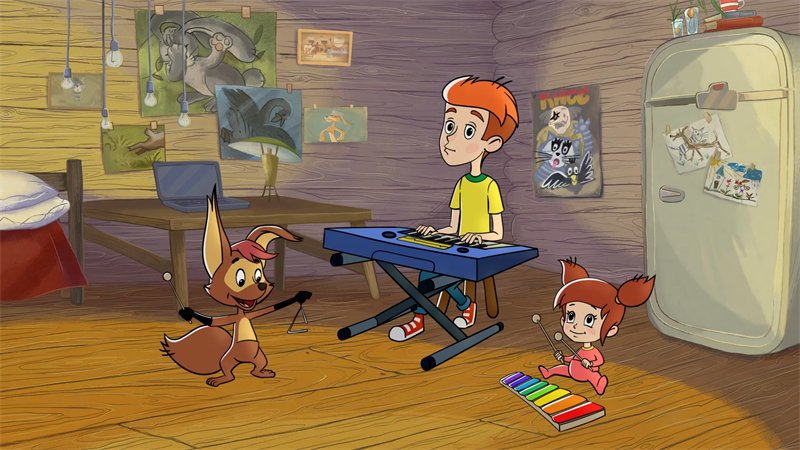 Когда Матроскин открыл дверь, он увидел такую картину: Вера Павловна стучала по металлофону, Тама-Тама звонила в треугольник, а Дядя Фёдор нажимал на клавиши электропианино.