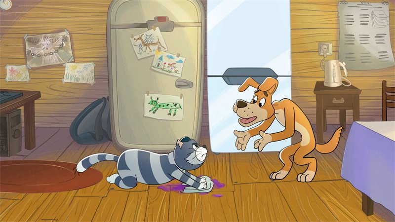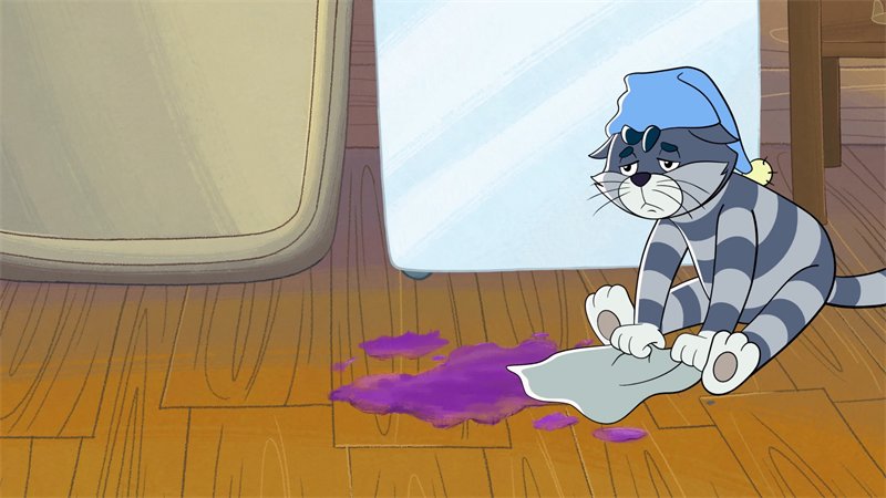 Шарик зашёл в дом и увидел, как Матроскин старательно оттирает от пола перед холодильником фиолетовое пятно. Кот очень любил во всём порядок.