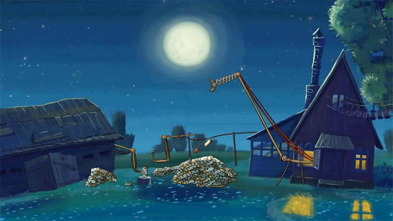 Шарик начал шагать по ней и запустил механизм уборки, который собрали Тама-Тама и Вера Павловна. Метёлки подметали пол, топор рубил дрова, а клешни складывали поленницу. Последнее полено оказалось лишним: башня с грохотом развалилась и разбудила всех жильцов.