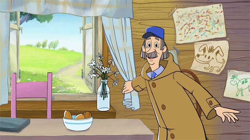 А это, оказывается, Печкин в дом зашёл и уже за столом уселся.
