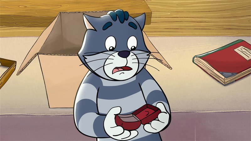 Матроскин в ужасе ахнул, увидев пустоту вместо рубля, схватил картонную коробку, начал её трясти. Оттуда посыпались пуговицы, скрепки, кнопки, напёрсток… А рубля – нет!