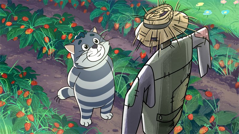 Поставил Матроскин пугало на клубничной грядке, но стоило ему только отвернуться – как оно упало, а вороны ррраз – и все ягоды склевали!