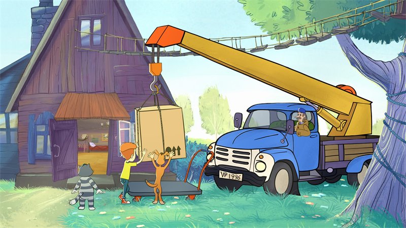 Выскочили Шарик с Дядей Фёдором на улицу, а там на специальном автокране огромную коробку привезли и на землю опускают.