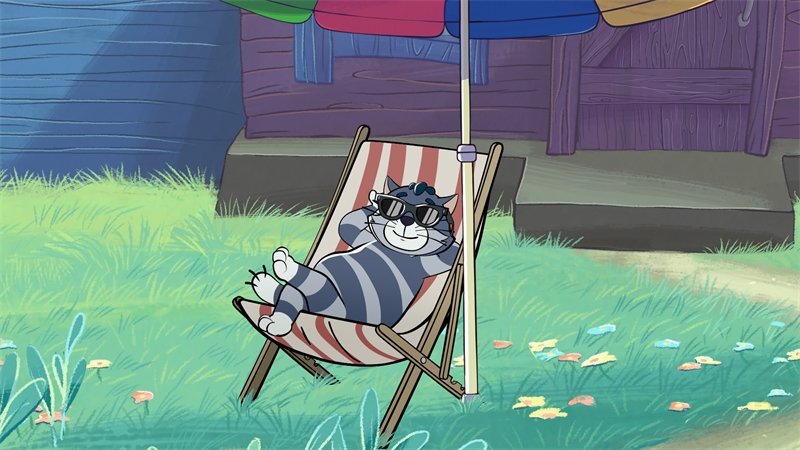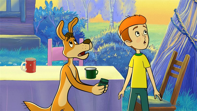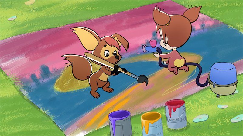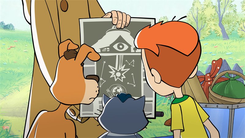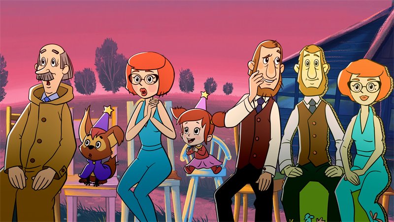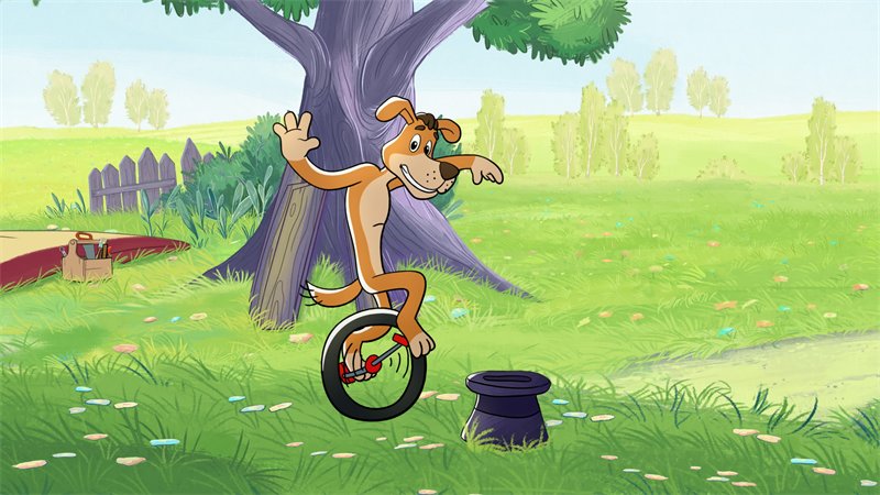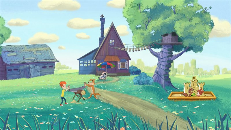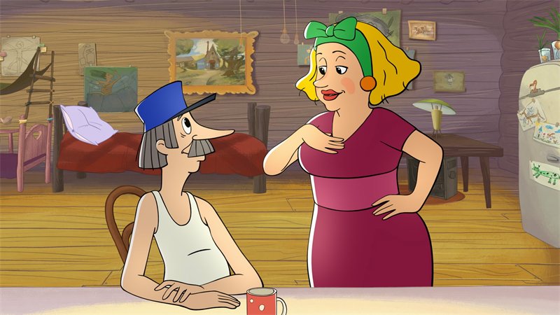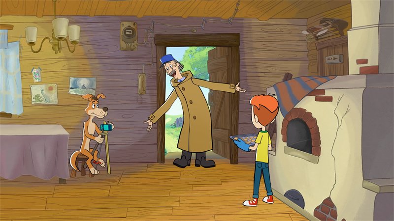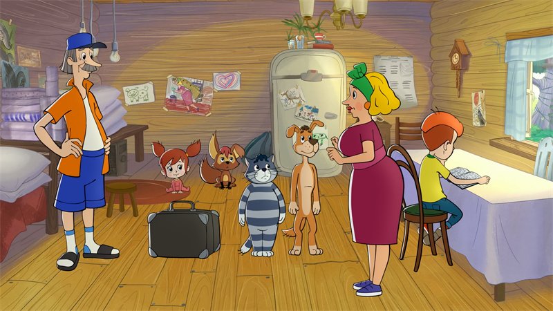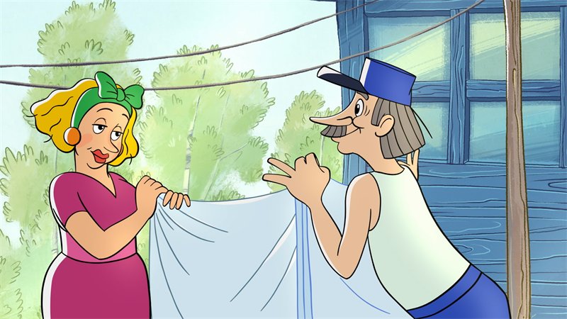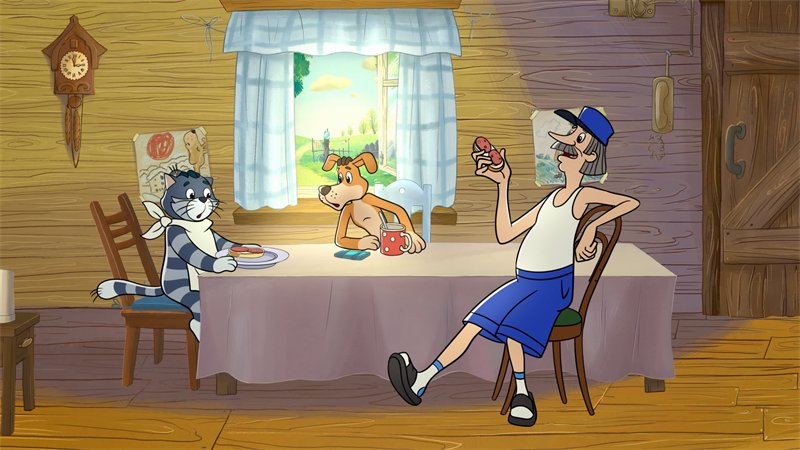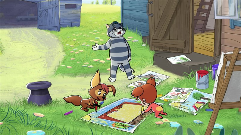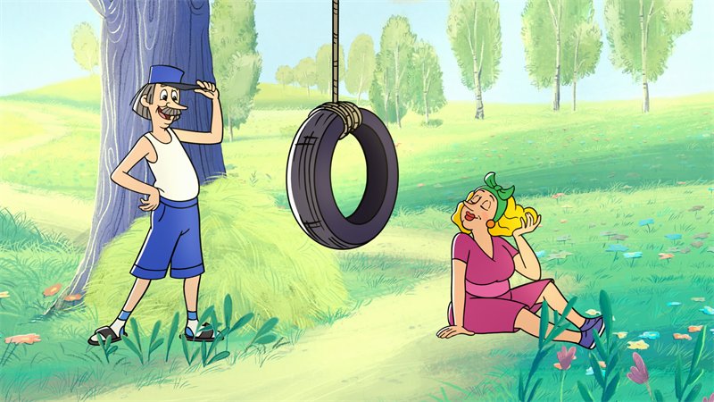 Вот и сегодня в Простоквашино что-то затевается. Дядя Фёдор какой-то ковёр на траве раскатывает, Шарик на колесе с педалями балансирует, а Тама-Тама и Вера Павловна увлечённо рисуют.