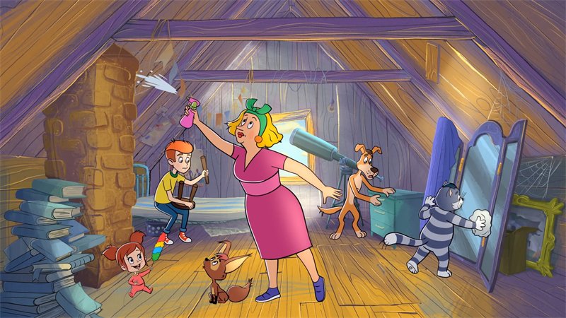 Что-то происходит на чердаке простоквашинского дома… А это все заняты большой, даже огромной, уборкой! Дядя Фёдор ножку к старому табурету прикручивает, Маргарита Егоровна воздух из распылителя освежает, Матроскин зеркало моет, Тама-Тама и Вера Павловна с щёткой для пыли играют, а Шарик старый комод проверяет.