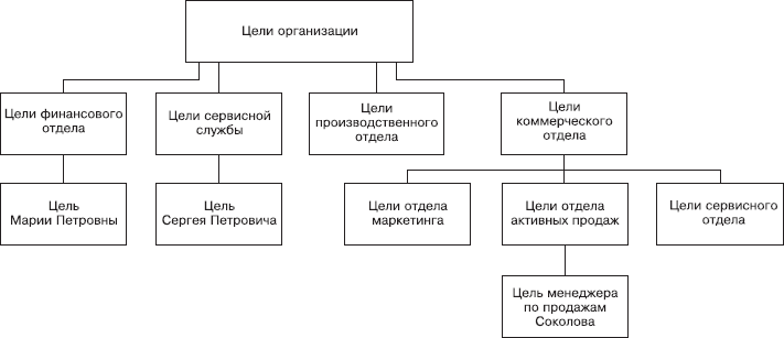 • Цели разрабатываются для каждого сотрудника с помощью метода каскадирования. Сначала задаются цели всей организации (по сути, они являются целями первого лица компании), потом они распределяются по направлениям, например для руководителей финансового, производственного и коммерческого отделов. Далее в коммерческом отделе формулируются цели для подразделения активных продаж, сервисного отдела и отдела маркетинга, а уж из отдела активных продаж они попадают к конкретному менеджеру по продажам Соколову (рис. 2.2). Таким образом, если милая бухгалтер Мария Петровна, интеллектуальный руководитель сервисной службы Сергей Петрович и немного ленивый менеджер Соколов каждый день выполняют поставленные цели, они каждый день двигают организацию в верном направлении.