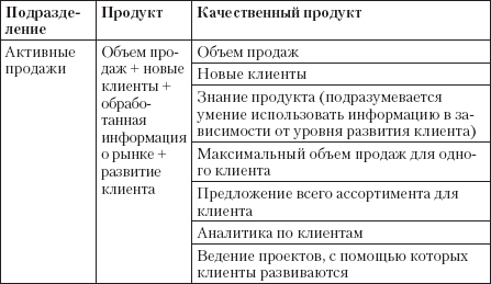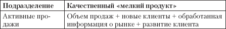 При создании критериев оценки общие цели: «объем продаж – 55 млн долларов» и «количество новых клиентов – 55 компаний» – автоматически переходят в KPI всего подразделения. Однако невозможно достичь этих целей без грамотной обработки информации о рынке и без умения развивать бизнес клиента. Таким образом, качественный «маленький продукт», который производит отдел активных продаж, состоит из объема продаж, новых клиентов, обработанной информации о рынке и развития собственных клиентов.