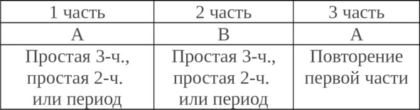 Промежуточная форма между простой и сложной 3-частной формами – это форма, где крайние части (А) – период, а средняя часть – в простой двух– или трёхчастной форме.