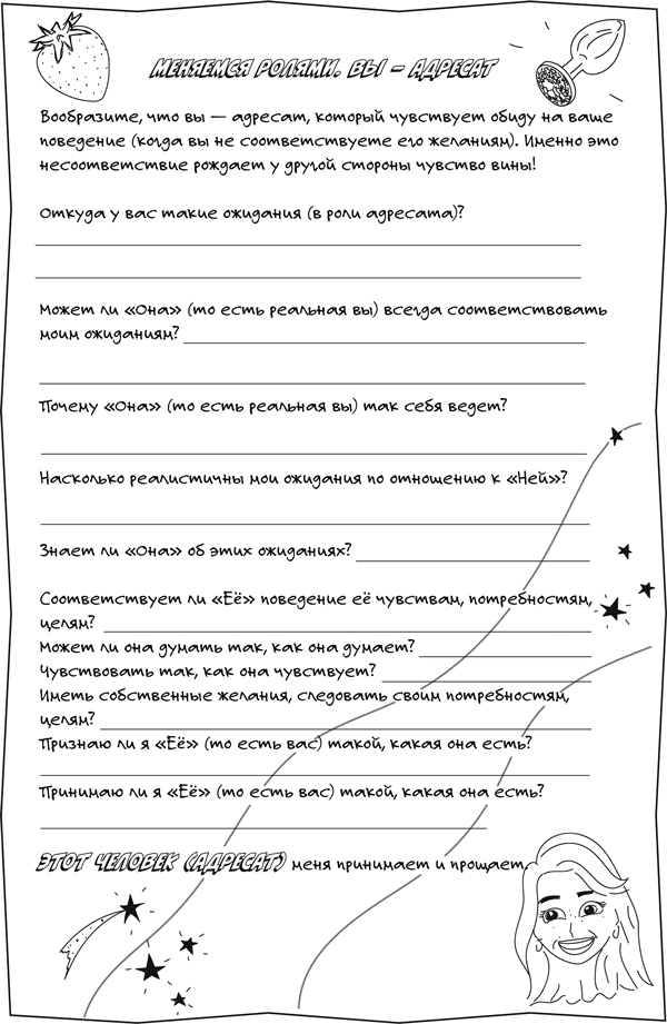Следующее трудное задание. Поменяйтесь ролями. Представьте, что вы – это не вы, а противоположная сторона. Вообразите себя вашей мамой, мамой мамы или папой, или кем-то еще. Теперь вы – это человек, который затаил обиду за ваше поведение (в котором вы не соответствуете его желаниям и ожиданиям). Именно несоответствие его желаниям рождает у другой стороны чувство вины!