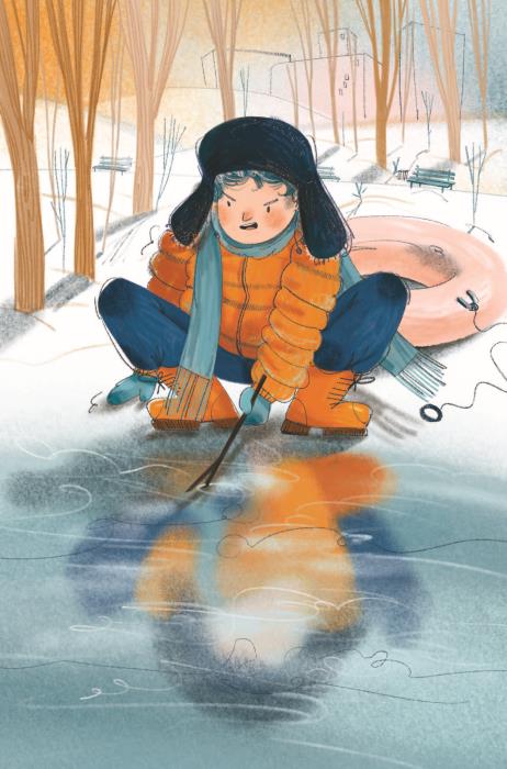 Спустя два дня Коля стучал лыжной палкой по льду пруда в парке. Но лёд и не думал поддаваться. Несмотря на запрет мамы, Коле очень хотелось узнать, как ватрушка поведёт себя на воде. Лучше, конечно, поплыть по Москве-реке: зимой она не замерзает. Однако он не решился – не хватало ещё попасть под баржу. Поэтому придумал сделать полынью посреди пруда. Коля то ковырял лёд маленьким совком, который взял на время у сестры, то долбил палкой. От напряжения он высунул язык, вспотел, скинул шапку и куртку, но за полчаса вырыл лишь жалкую ямку. Вот и поплавал! Ну почему ему так не везёт?! Раздосадованный, побрёл он к дому, волоча за собой так и не пригодившуюся ватрушку. Вдалеке мигал огоньками в окнах университет, похожий на верхушку кленового листа.