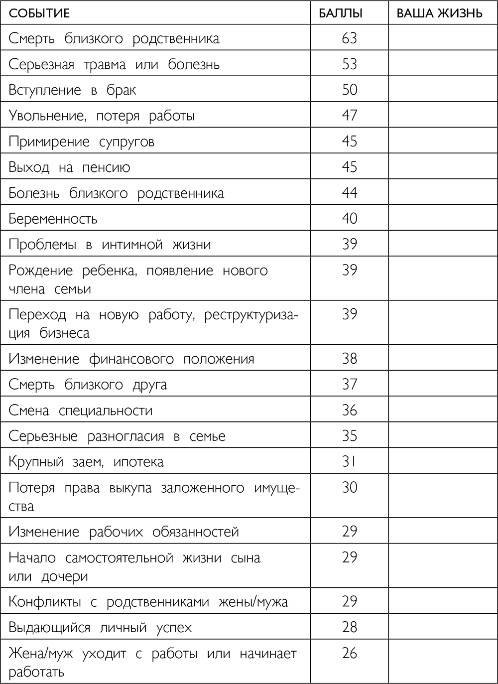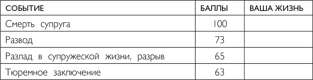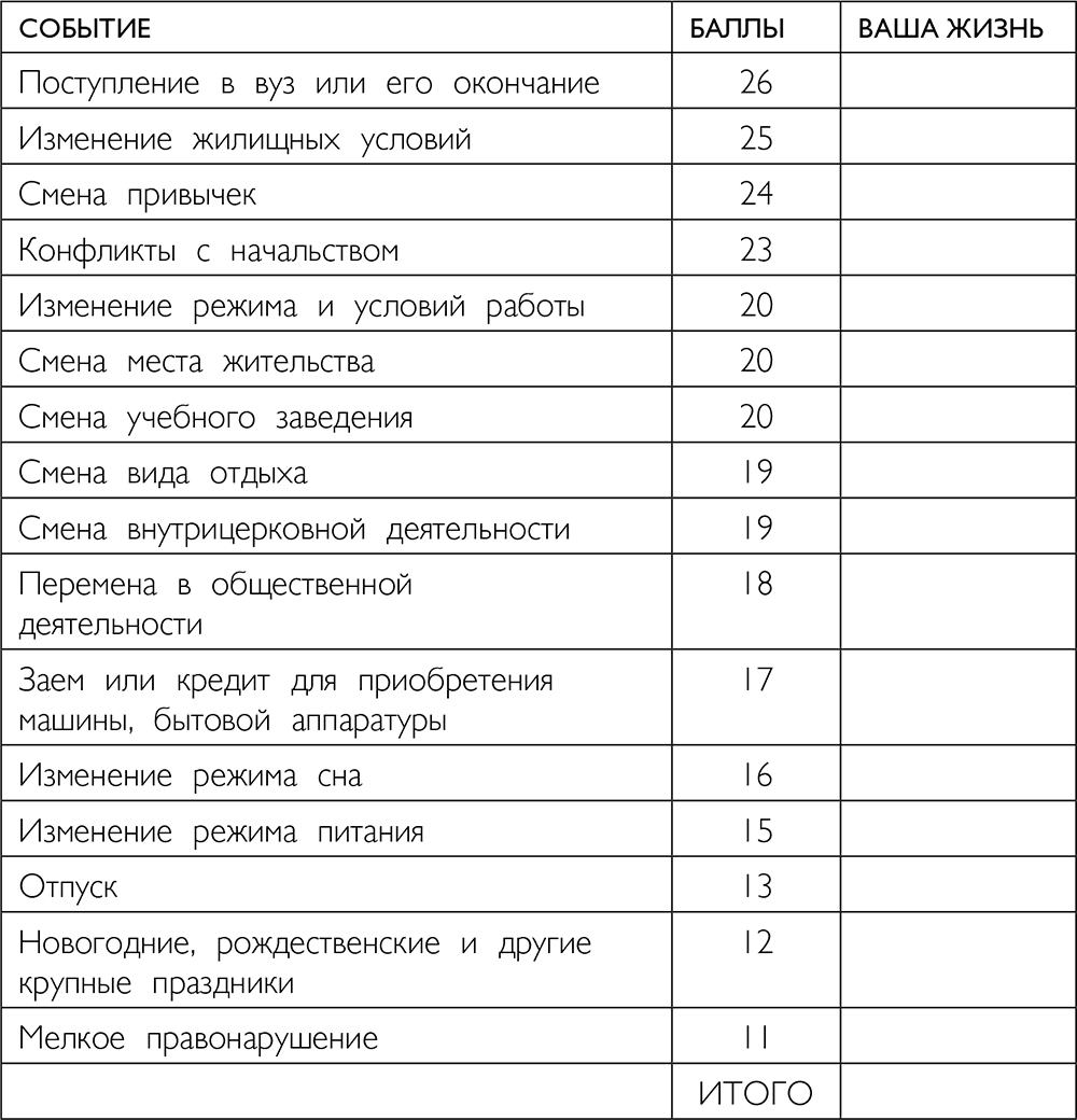 Существует специальная шкала стресса, разработанная американскими учеными Томасом Холмсом и Ричардом Рэем, которая позволяет определить, насколько велик в вашей жизни уровень напряжения. Если вы считаете, что ваша жизнь спокойна и в ней не происходит ничего такого, что могло бы быть оправданием вашей полноты, проанализируйте последний год, а лучше три, по этой шкале.