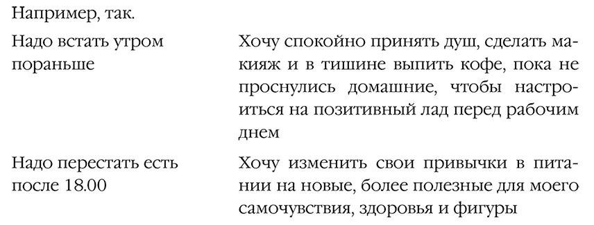 Обратите внимание: нужно не просто заменить слово, но найти потребность, которая требует удовлетворения. Если мы действительно превращаем «надо» в «хочу», то появляется внутренняя мотивация. Если же не появляется, возникает вопрос: «Действительно ли мне этого хочется? Кому это надо?»