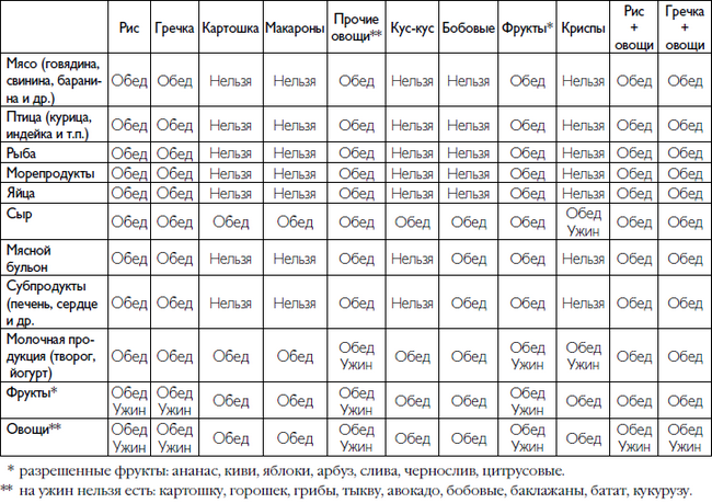 Сочетать между собой можно только продукты из одного варианта, кроме Варианта № 6 «Мясные и рыбные продукты».