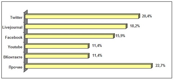 Почти половина опрошенных нами компаний оценили уровень использования социальных медиа в качестве каналов корпоративных коммуникаций в кризисный период как низкий (Рис. 12). Компании либо ограничивались небольшим количеством ресурсов (от 1 до 3, при этом чаще других упоминался «Живой Журнал» – LiveJournal), либо активность в них была минимальной. В то же время эксперты, оценившие уровень как средний либо высокий, использовали как небольшое количество ресурсов (от 1 до 3), так и значительное (более 6), а также неназванные «собственные каналы» и «корпоративные порталы». Таким образом, представленные на рис. 12 данные не могут свидетельствовать об общих тенденциях, поскольку эксперты использовали принципиально разные оценочные подходы. Наиболее востребованными среди наших экспертов оказались такие ресурсы, как Twitter, Facebook и LiveJournal (Рис. 13). Их использовали для «работы с жалобами», «продвижения» компании или брендов, «поддержания дискуссий», «нейтрализации негатива в отношении продукции», для публикации новостей компании и отрасли, размещения ссылок на актуальные материалы и исследования.