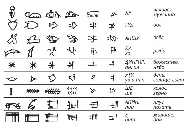 Со временем знаки-картинки (пиктограммы) превратились в знаки-звуки (фонограммы). Например, пиктограмма, изображающая горшок с молоком, стала ещё и слогом [га], так как в шумерском языке слово «га» обозначало молоко, знак горы стал слогом [кур], знак рта – слогом [ка] и так далее. Менялись и сами знаки письменности, они всё меньше походили на картинки, стали гораздо проще, схематичнее.
