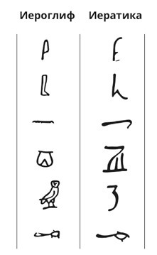 В разное время в египетской письменности существовало от 800 до 7000 символов, которые обозначали и какой-то предмет, и абстрактное понятие, и один или несколько согласных звуков. Для гласных отдельных иероглифов не было, поэтому учёные XIX века придумали вставлять при чтении для удобства [е] между согласными. Египтяне не ставили пробелов и знаков препинания. А писали и слева направо, и справа налево. Куда «смотрят» люди и животные, там и начало предложения.