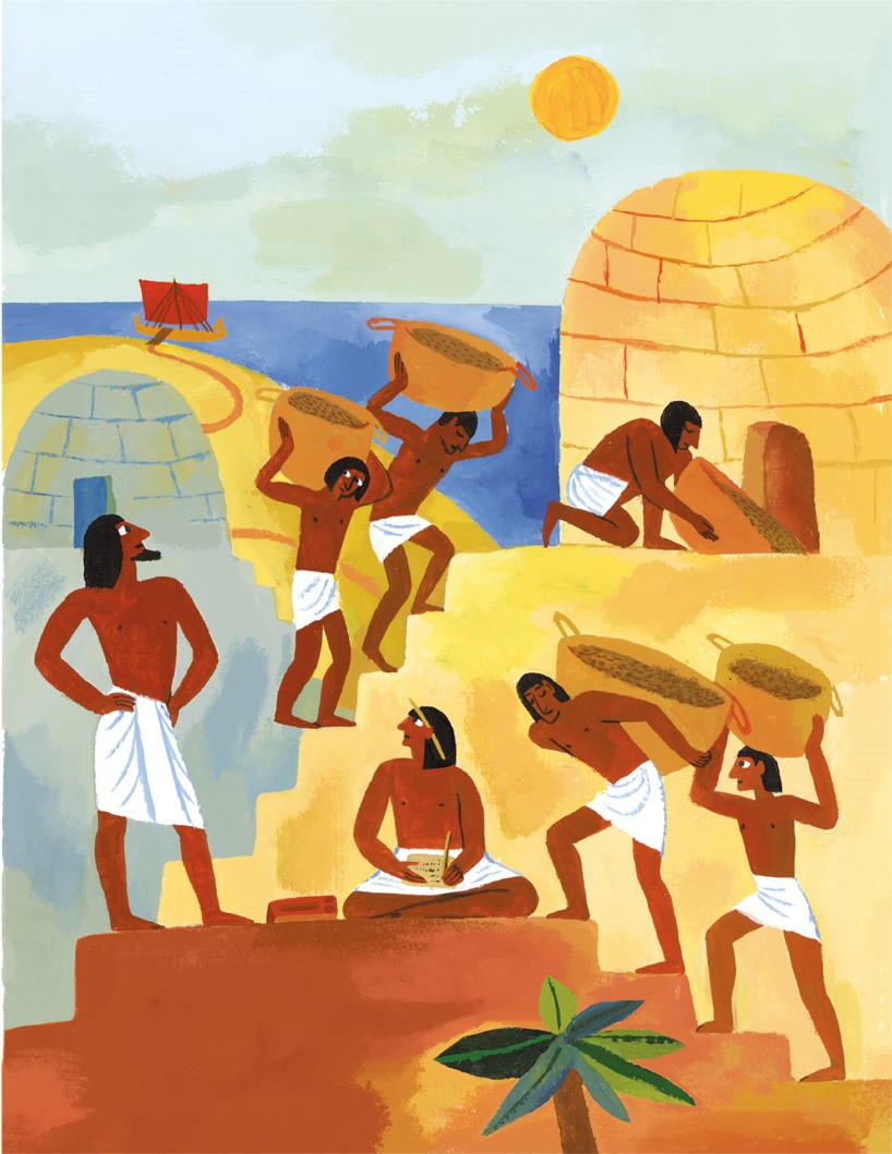 Ничто не расскажет лучше о жизни египтян, чем росписи на стенах гробниц. Вот строители месят глину для кирпичей, горшечники лепят посуду, земледельцы возделывают поле и собирают виноград, кто-то несёт воду на коромысле, другие раздувают угли в печи, чтобы плавить металл… А вот сидит, скрестив ноги, человек, на коленях у него листок, в руке тростинка, а за ухом ещё две. Это писец. Писцы следят за работой, будь то строительство пирамид или орошение полей, подсчитывают урожай и военную добычу, собирают налоги. И обязательно всё записывают!