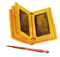 В руках писца тростниковая палочка – стилос, а рядом с ним пенал для запасных стилосов и красок. Сухую чёрную и красную краски надо сначала развести водой, а потом окунать в них тростинку.