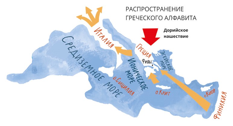По преданию, финикийский алфавит в Грецию привёз царь Кадм, основатель города Фивы. Он перемешал буквы, но «альфу» (так греки называли «алеф») оставил первой, ведь Фивы славились своими быками.