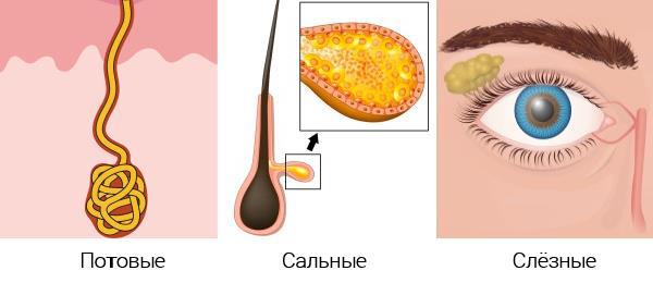 • апокриновые железы находятся лишь в определенных местах кожного покрова, например, в подмышечных впадинах, коже лба, области заднего прохода, гениталиях; развиваются в период полового созревания организма. Разновидностью апокриновых потовых желез являются железы век и железы, выделяющие ушную серу.