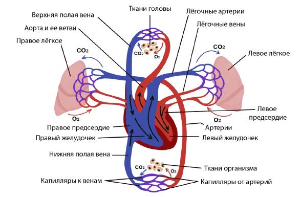 Круги кровообращения человека. Сердечно-сосудистая система бывает замкнутая и незамкнутая. У человека, как и у всех позвоночных, она замкнутая. Там, где сосудистая система замкнута, образует круг кровообращения. У человека и у некоторых позвоночных (все, кроме рыб) животных есть несколько кругов кровообращения, обменивающихся кровью между собой только в сердце. Круг кровообращения состоит из 2 последовательно соединённых кругов (петель), начинающихся желудочками сердца и впадающих в предсердия. Весь путь кровообращения образует два соединённых последовательно круга кровообращения: большой, или телесный, обеспечивающий приток крови к органам и от них обратно в сердце, и малый, или легочный, по которому кровь из сердца направляется в легкие, где происходит газообмен между кровью и воздухом, заполняющим альвеолы, а затем возвращается в левое предсердие.