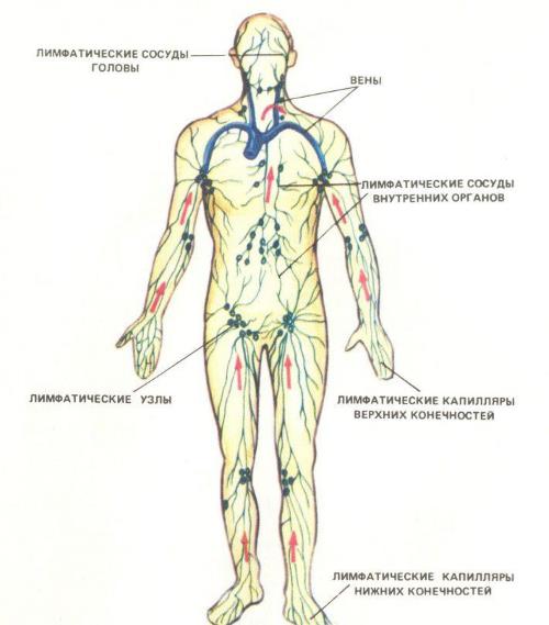 Наряду с кровеносными капиллярами в тканях представлены сети лимфатических капилляров, из которых начинаются лимфатические сосуды, отводящих лимфу из органов к регионарным лимфатическим узлам, затем по лимфатическим стволам в грудной проток и правый лимфатический проток, впадающие в вены в местах соединения внутренней яремной и подключичной вен.