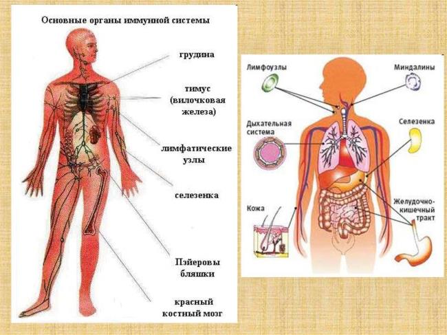 Иммунная система. К органам иммунной системы (лимфоидным органам) помимо костного мозга относятся: тимус (орган созревания и дифференцировки Т-лимфоцитов), скопления лимфоидной ткани в стенках полых органов пищеварительной, дыхательной и мочеполовой систем, селезёнка, лимфатические узлы. Костный мозг и тимус относятся к центральным органам иммунной системы, остальные – к периферическим.