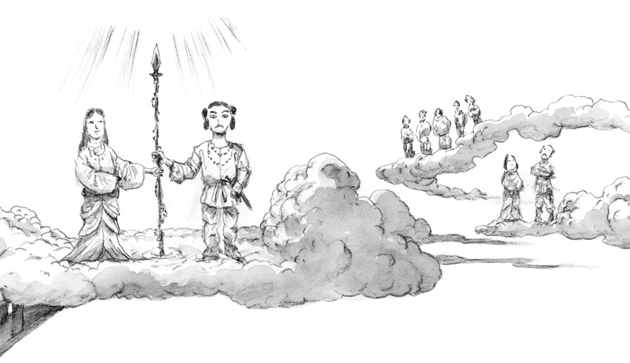 Идзанаки и Идзанами взяли копье и встали на мост, соединяющий Небо и Землю. В бесформенную, плавающую в море землю погрузили они длинное копье и стали ее перемешивать.