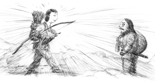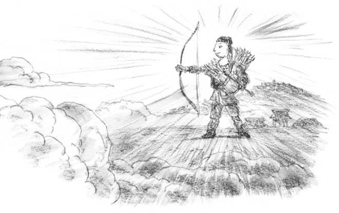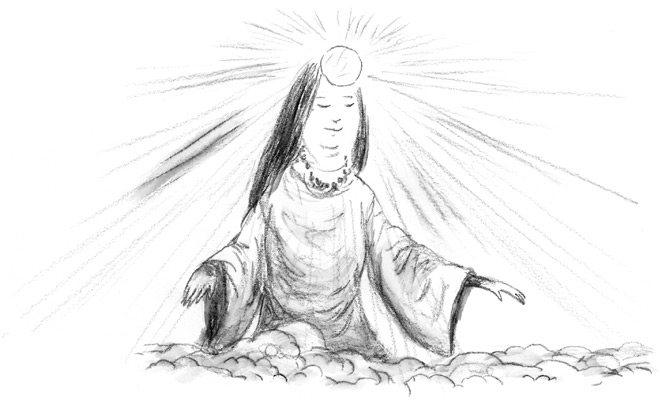Когда взяла она в руки большой лук и зашагала, земля проседала под ней. Аматэрасу преградила Сусаноо путь.