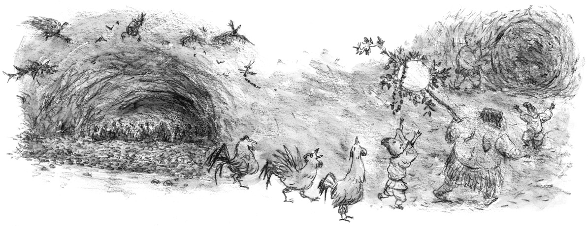 Омоиканэ велел собрать столько петухов, сколько возможно, и наказал им петь.