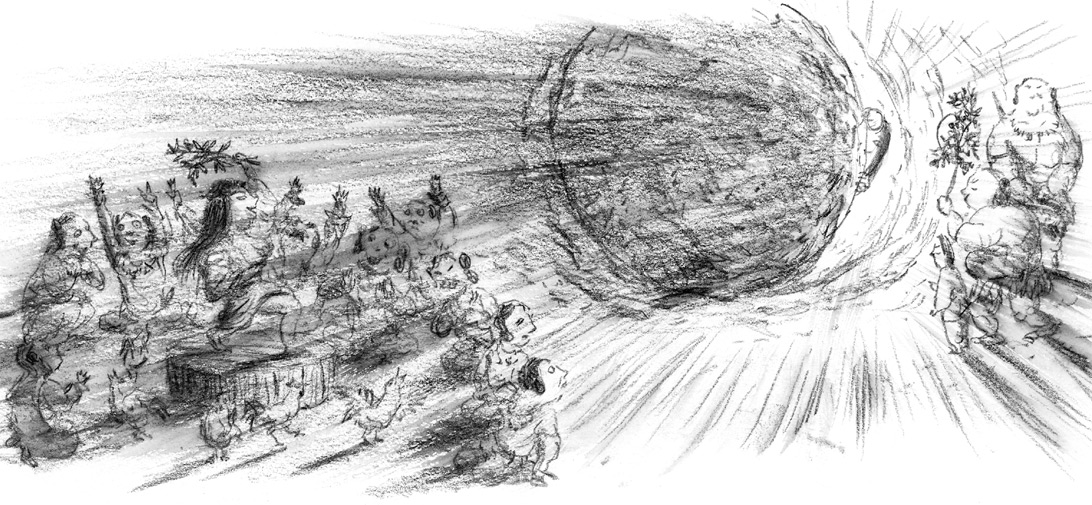 Это были те восемь богов-громов, что толпились у тела мертвой Идзанами. Боги грома, взяв с собой полуторатысячное воинство Страны Мрака, гнались за Идзанаки.