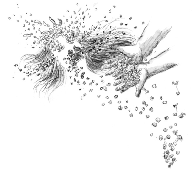 Из тела убитой богини родилось множество разных вещей. Из головы – шелковичные черви, из глаз – рассада риса, из ушей – просо, из носа – красная фасоль, из паха – злаки, из зада – соевые бобы…