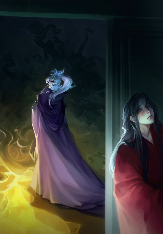 «Некто», ни слова не говоря, подкрался к нему и резко хлопнул по свитку рукой. Тот упал на стол, а на Муана уставились горящие глаза с золотыми сполохами. Шен сел перед столиком, положив локти на столешницу, нагнулся к Муану и загадочно посмотрел на него.
