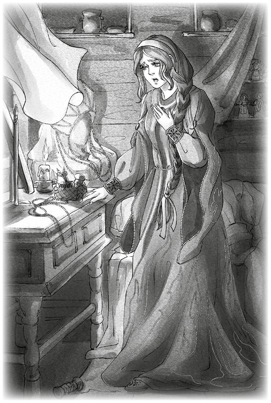 Меж тем близится час заветный. У Горданы платье уж давно готово, а Ясна все никак последние бусины приладить не может: и так не ложатся, и эдак. Расплакалась, бросила шитье, отвернулась прочь – глядь, а у стены сестрино платье висит. Тысячи свечей в драгоценных бусинках пляшут, кружево точно инеем соткано, тонкое да воздушное, так и манит. Подошла Ясна, провела рукой по бусинкам, прокатила между пальцев бахрому жемчужную. Холодное. Да ведь и в горнице не тепло.