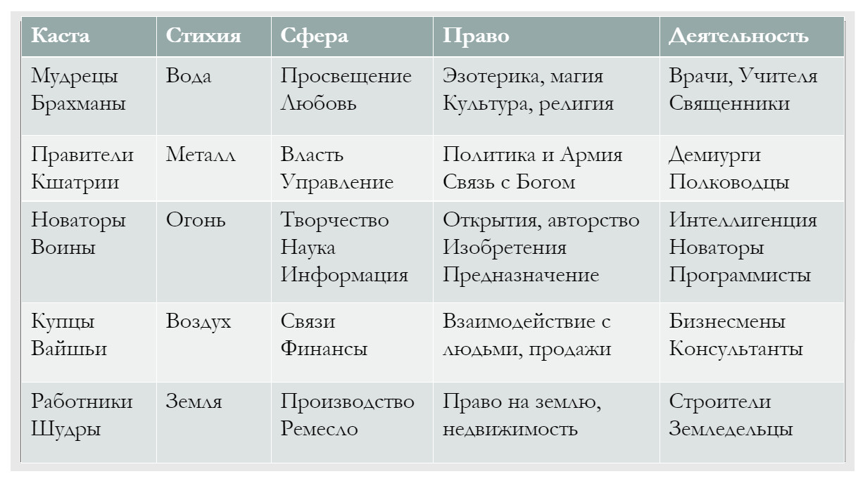 Пятая Каста это – Брахманы, Мудрецы, Гуманисты. Это высшая Каста в плане духовного развития. Сюда относятся целители, эзотерики, жрецы, учителя, наставники, духовники. Это цвет общества.
