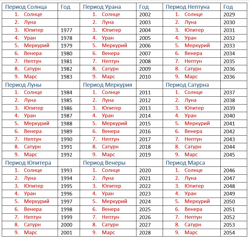 Каждый 9-летний Период – это не просто временной отрезок, а особая «ступень» в развитии личности, в которой главную роль играет определённая Планета.