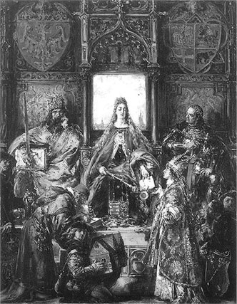 Епископ краковский Петр Выш призвал Ядвигу на духовный подвиг. Обращение Литвы в католицизм, союз против Тевтонского ордена – все это ради Польши, ради христианской веры. Осознав неизбежность происходящего, Ядвига отправила к нему доверенного человека. Она вообще не могла себе представить, что значит не веровать во Христа. К тому же о язычниках ходили страшные слухи: говорили, что они дикари и ходят в шкурах. Поэтому королева велела своему посланцу убедиться, человек ли вообще этот Ягайло. И ее слуга, честно исполняя поручение, прежде всего пошел с Ягайло в баню, чтобы проверить, не отличается ли строение его тела от человеческого. После этого он доложил Ядвиге, что ее будущий жених точно человек. Это ее немного успокоило. Но ей никогда уже не суждено было стать счастливой. Потерпев поражение в борьбе за свое счастье, она вынуждена была пойти под венец с диким и свирепым язычником.