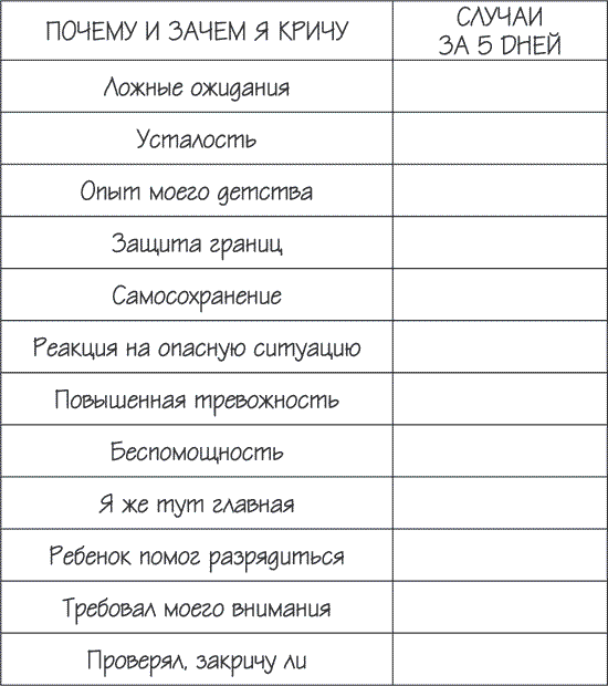 Достаточно легкое и одновременно сложное упражнение. Нарисуйте таблицу с двумя столбцами. В первом столбце напишите, почему и зачем вы кричите на ребенка (усталость, ложные ожидания и т. д.), а во втором ставьте палочки, когда вы накричали. То есть вам нужно будет каждый раз анализировать причину вашего крика. Заполняйте эту табличку хотя бы 5 дней. И тогда вам будет наглядно видно, в каком направлении нужно работать над собой.