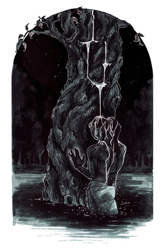 Я не стала ничего ни объяснять, ни просить, полагая, что непостижимым существам, живущим внутри, и так все известно. Лишь открыла им свое сердце и воспоминания. Все до единого. Все переживалось так странно, будто сон перемешался с реальностью. Казалось, вместо грудной клетки у меня дыра и ночной ветерок спокойно проходит сквозь нее, подхватывая и относя к далеким мощным ветвям все чувства, переживания и надежды. Иногда я видела эти картинки, которые моими глазами смотрели духи: обрывки того, во что верила, чем гордилась, чего боялась и о чем не хотела даже вспоминать. Краем глаза я увидела, что к дереву подходит Марко. В его руках лежали кристаллы, когда-то бывшие сердцами элементалей. Он наклонился и отпустил их в воду. Световые искры сгустились вокруг рубиновых камней и ушли на дно. Пальцы молодого мага также коснулись огромного ствола, глаза закрылись. Рина, Хамару, Айлин, ее братья и родители – теперь все стояли хороводом в молчаливом смирении и терпеливом ожидании. Приезд чужаков снова привлек внимание жителей Тал Марита, и они постепенно проявлялись, выходя из темноты на тусклый свет волшебных частиц, вьющихся над водой. Вдруг над нашими головами что-то хрустнуло, и по берегу прокатился легкий гул голосов. Андре сделал глубокий шумный вдох, словно что-то долго пережимало ему горло. Повернувшись, я увидела, что кора над его головой разошлась, а из получившейся воронки в темечко мага тянется струйка светящегося, белого, как молоко, сока. Волшебное мерцание струилось по щекам, голым плечам, груди и спине, уходя в воду. На темной синеватой коже начали проступать сияющие белые символы песен богов. Они пульсировали и перемещались, вспыхивали и сменялись другими, пока все его тело не заполнилось ими. Асфиры на берегу шумели и охали все громче. Мы же, стоящие у дерева, окружили Андре, не в силах отвести глаз от происходящего. Казалось, светящаяся жидкость омывает его изнутри и снаружи, вытекая из уголков рта, из глаз, ушей и ноздрей. Грудь мага тяжело поднималась, иногда даже с легким стоном, но ладони по-прежнему были крепко прижаты к священному дереву. Наконец источник начал иссякать, измельчал до капель и остановился совсем. Мерцающая жидкость и символы медленно таяли, словно высыхая или впитываясь. Маг открыл глаза и поклонился. Крики сорвались с губ всех присутствующих и, словно стая диких птиц, поднялись в непроглядные высокие кроны.