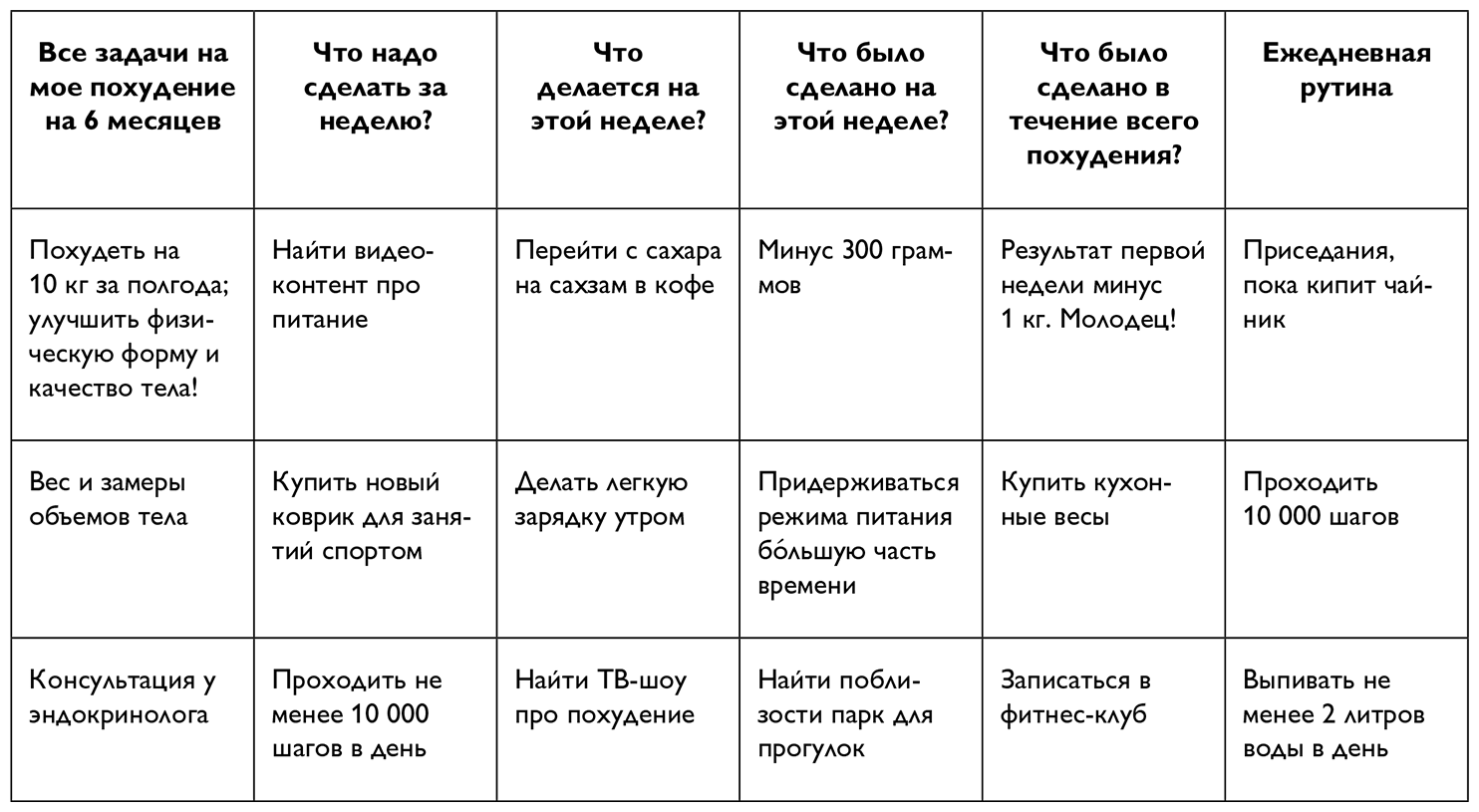 Это общий список заданий, пожеланий, решений и идей, помогающих вам худеть. Например, пройти обследование у эндокринолога, изучить систему правильного питания, просчитать идеальную массу тела и суточный обмен веществ, ежедневно просматривать одно видео на тему похудения и слушать подкасты о правильном питании по дороге на работу, начать бегать на школьном дворе, качать пресс и делать легкую зарядку вечером перед телевизором, выпивать достаточное количество жидкости в день, нормализовать сон, начать пить поливитамины, записаться в бассейн, купить коврик и гантели для занятий спортом, отказаться от сахара в кофе, купить сахарозаменитель и т. д.