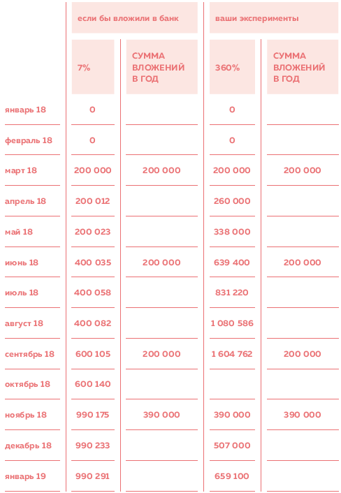 Интерактивная таблица представлена в материалах на сайте woman.fincult.ru – просто добавь свои данные и посчитаешь, что выгоднее. В приведенной таблице выше девушка ссылалась на то, что она выводила регулярно со своего счета форекс по 30 000 рублей. Но не учитывала, сколько заливала (вносила) обратно. И в какой-то момент счет ее обнулился, чтобы продолжить («отыграться») она завела туда снова 390 000 рублей. И когда счет обнулился во второй раз, она пришла ко мне на консультацию. Я предложила ей посчитать реальную выгоду от своих «инвестиций» и сравнить их с депозитом.