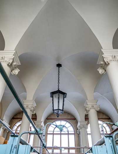 В столовой, а также в других залах сохранились мраморные резные камины. В особняке – две парадные лестницы, да и сам особняк разделен на две независимые части. Раньше вход в дом был через арку, в которой сегодня размещается библиотека. А когда‐то через арку можно было зайти в настоящий итальянский дворик. Внутреннее пространство арки перекрыто сводами, поддерживаемыми рядами тонких колонн. Из арки внутрь ведут две двери в две разные части дома: жилую и конторскую. Между собой они никак не связаны, а проход из одной части в другую возможен только через внутренний двор. В советское время проездная арка была застеклена и превращена в библиотеку.