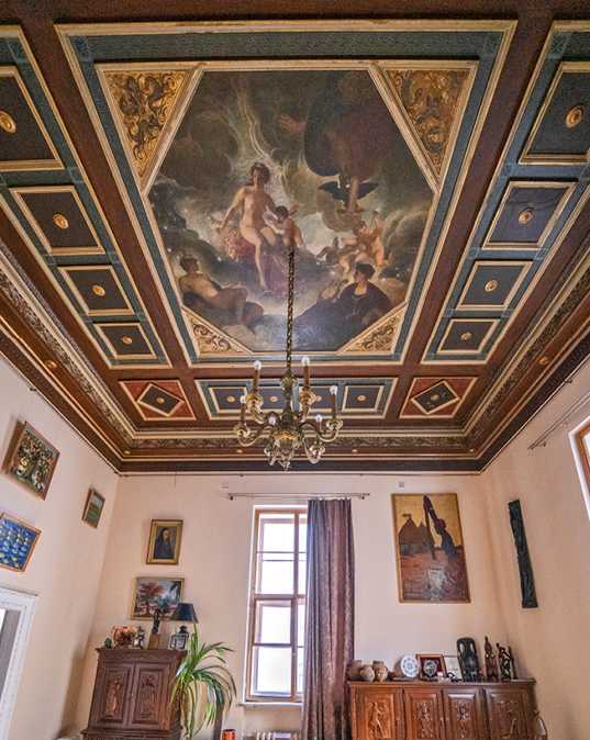 Живописная вставка на потолке парадной лестницы в конторской половине особняка. Автор росписи И. Нивинский